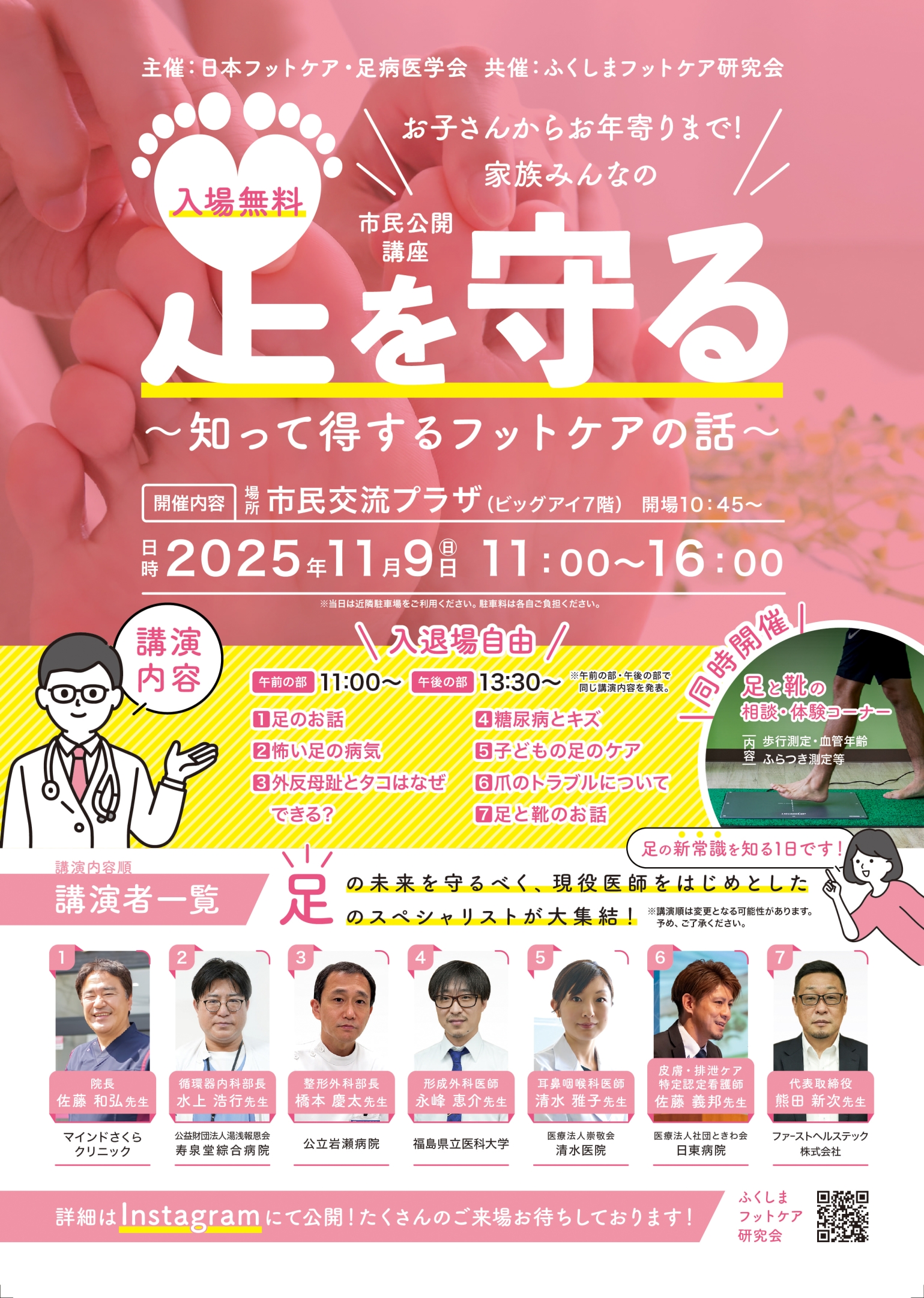 2025.10.30 市民公開講座開催のお知らせ 11月9日は市民公開講座開催となります。(本会会場にて)ふくしまフットケア研究会が運営となり、「足の健康」をテーマに多数のプログラムをご用意しております。本会から会長の水上と副会長の佐藤が講師を務めます。詳細はPDFをご覧ください。8日参加される方は、 ぜひご確認及びご来場をお待ちしております。[運営]ふくしまフットケア研究会WEBサイトInstagram PDFファイル